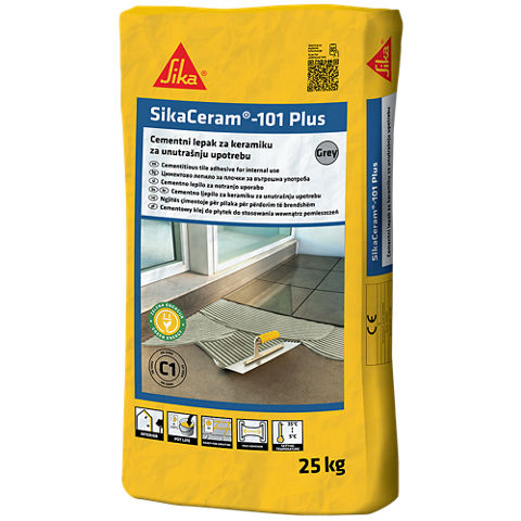 SikaCeram®-101 PLUS je pripremljena praškasta mešavina, veoma otpornih cemenata, sa sadržajem polimera, odabranih silikonskih/kvarcnih mineralnih punila sa specijalnim dodacima. Spreman za korišćenje uz dodatak vode. Može se koristiti za lepljenje keramičkih pločica na vertikalnim i horizontalnim unutrašnjim površinama.
