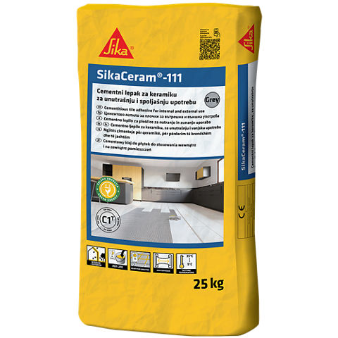 SikaCeram®-111 je pripremljena, polimer modifikovana, cementna mešavina sa odabranim mineralnim punilima i specijalnim dodacima. Može se koristiti za lepljenje keramičkih pločica na vertikalnim i horizontalnim, unutrašnjim i spoljašnjim površinama.