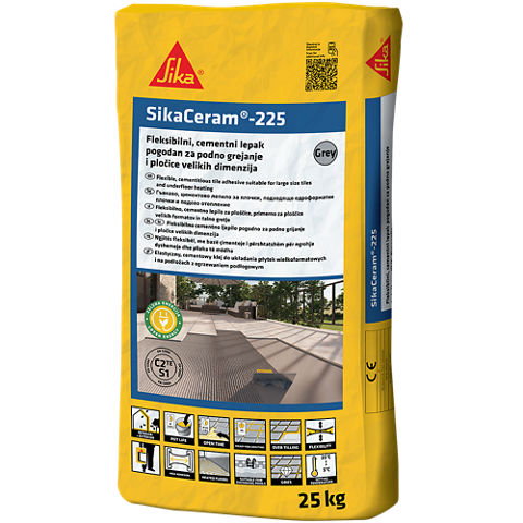 SikaCeram®-225 je pripremljena praškasta mešavina, visokokvalitetnih cemenata, sa sadržajem polimera, odabranih silikonskih/kvarcnih mineralnih punila sa specijalnim dodacima. Spreman za korišćenje uz dodatak vode. Može se koristiti za lepljenje keramičkih pločica na vertikalnim i horizontalnim, unutrašnjim i spoljašnjim površinama. Primenljiv i na podlogama kod kojih se očekuju deformacije (skupljanje, širenje...) izazvane naponima zatezanja ili temperaturnim promenama.