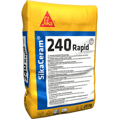 SikaCeram®-240 Rapid je sivi, polimer-modifikovani, cementni, brzovezujući lepak za podne i zidne pločice, otporan na mraz i sa smanjenim klizanjem. Pogodan za male i srednje keramičke pločice u stambenim i komercijalnim, mokrim i suvim okruženjima. Pogodan za lepljenje sve vrste keramike na sve vrste upijajućih i neupijajućih građevinskih podloga. Debljina sloja <10.0 mm. Unutrašnja i spoljašnja upotreba. Standard EN 12004: Klasifikacija - C2 FT. Proizvod može da se koristi i za tačkasto lepljenje izolacionih ploča u zatvorenom prostoru.
